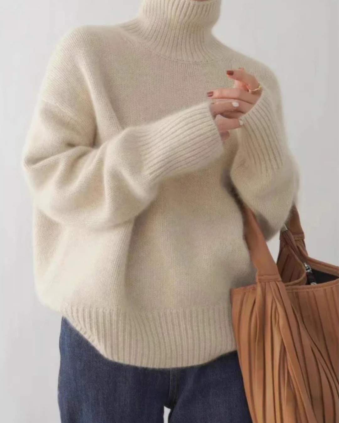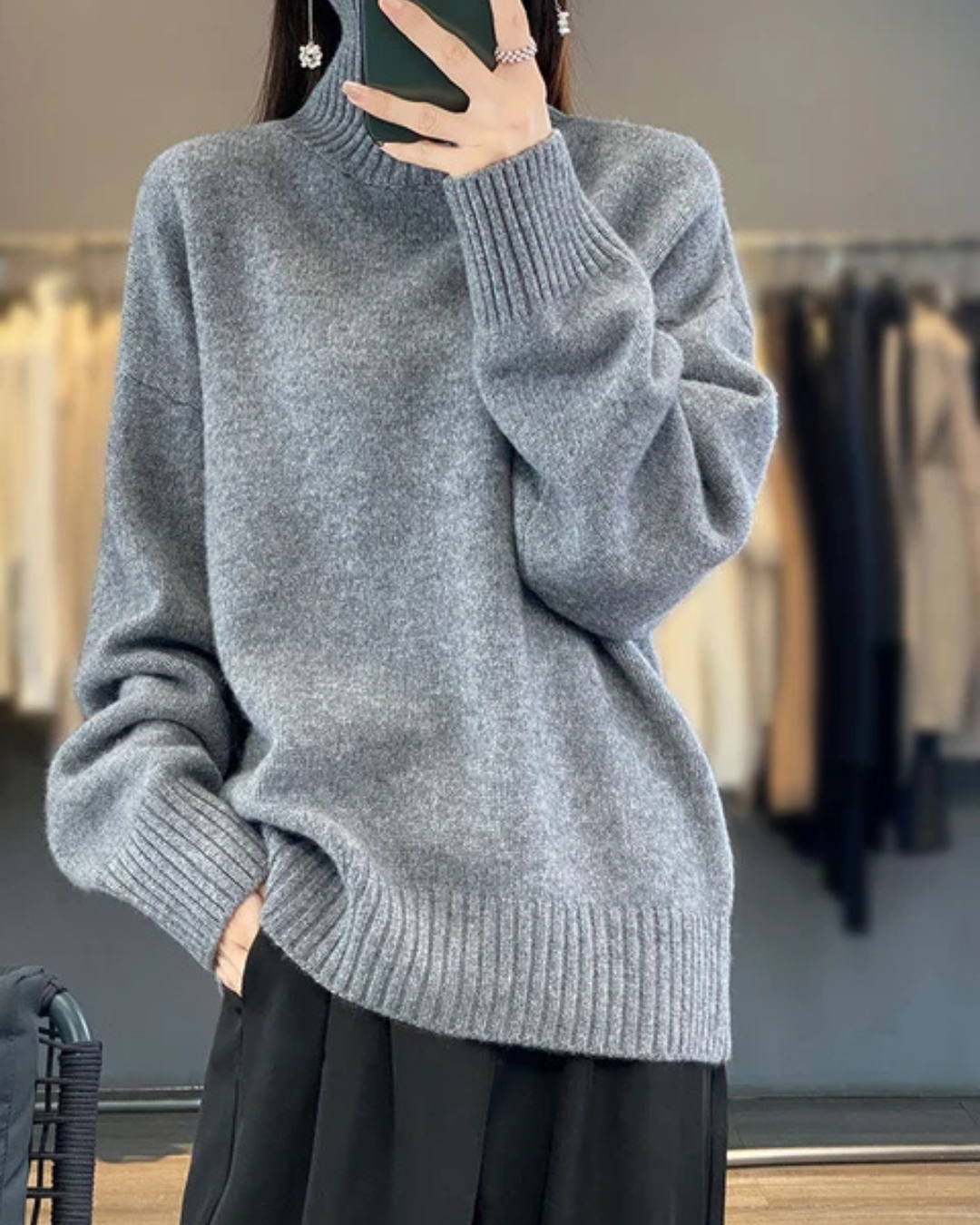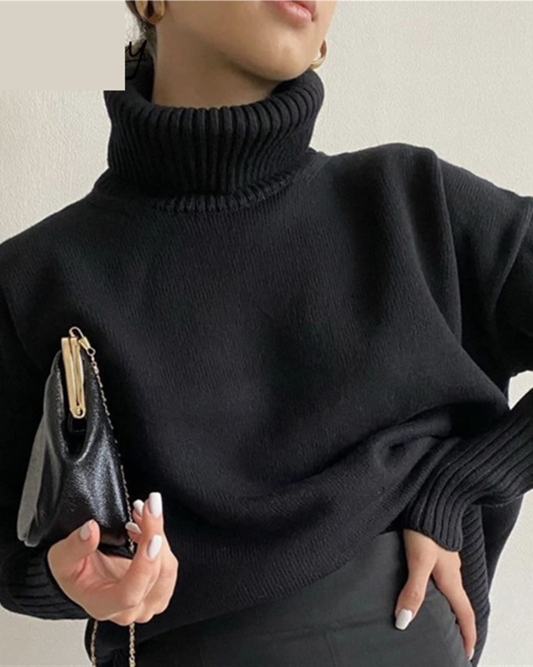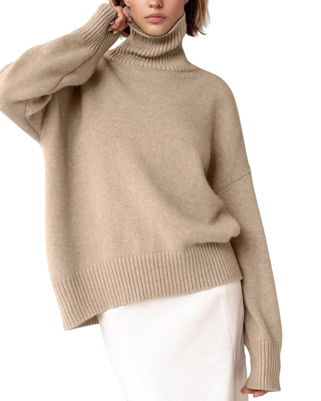 Dames coltrui met hoge opstaande geribbelde kraag en lange mouwen. Kenmerkt geribbelde manchetten aan mouweinden en geribbelde boordband aan onderzijde. Bevat pullover ontwerp zonder voorste sluiting en effen kleur constructie.