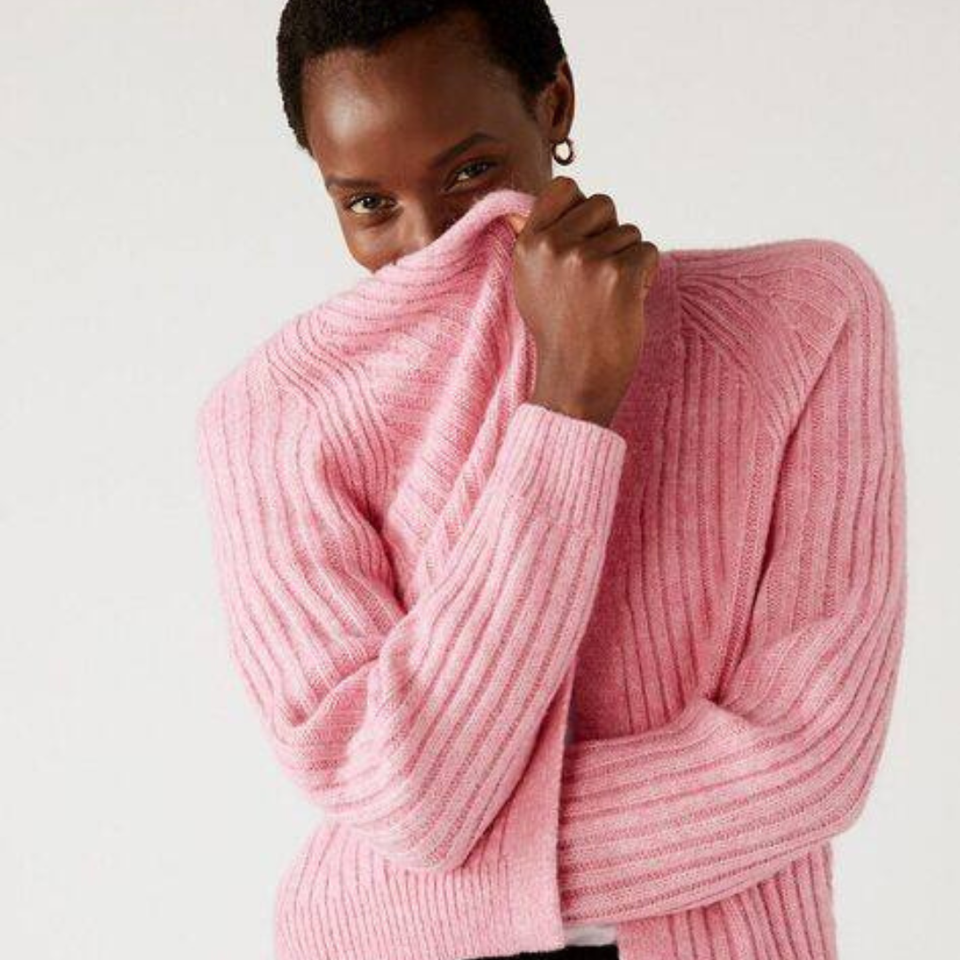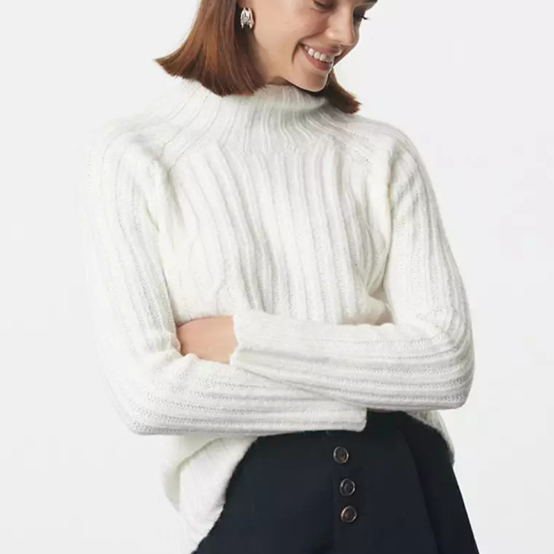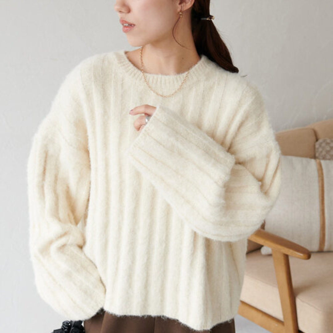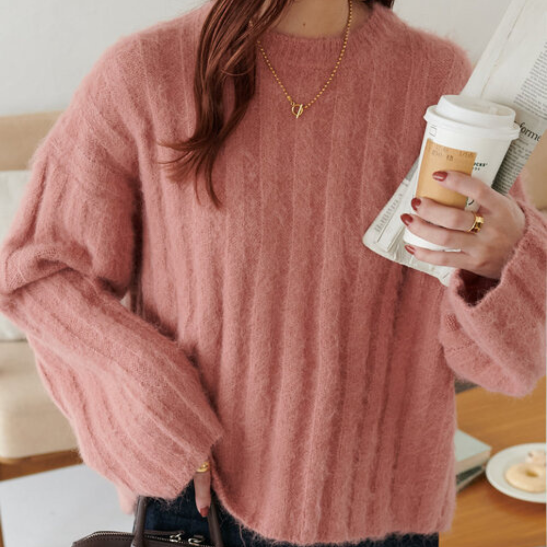 Dames gebreide trui met ronde hals en lange mouwen. Kenmerkt verticale ribbels aan voorzijde en geribbelde manchetten. Bevat geribbelde zoom aan onderzijde.