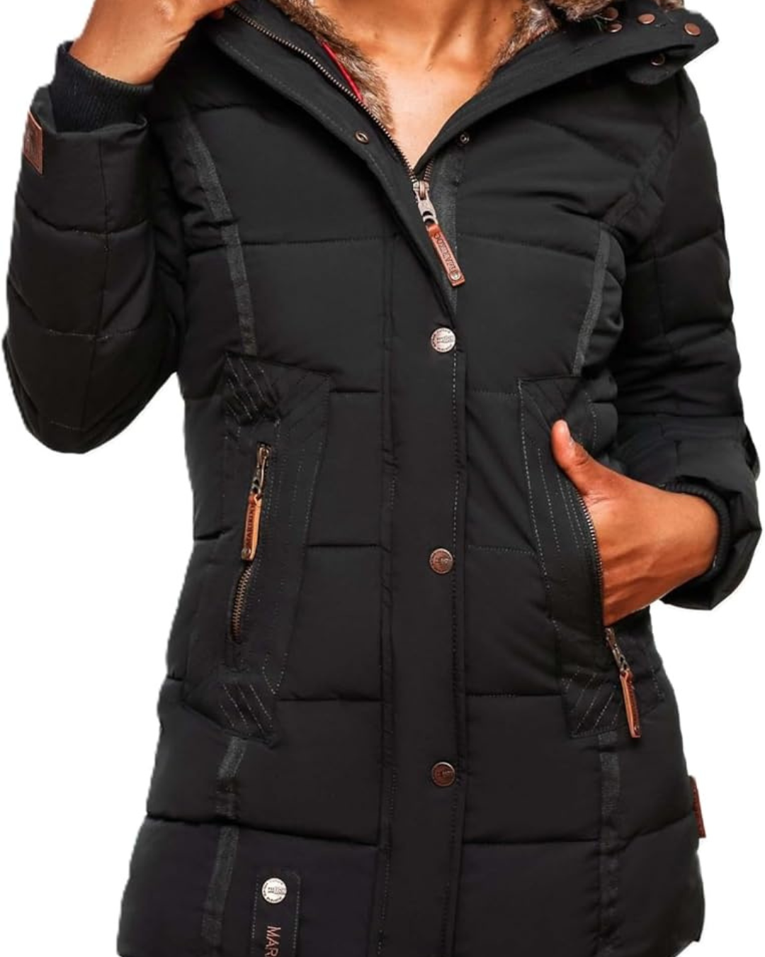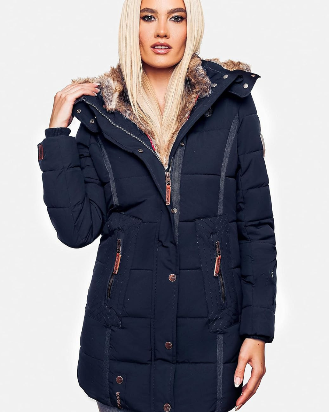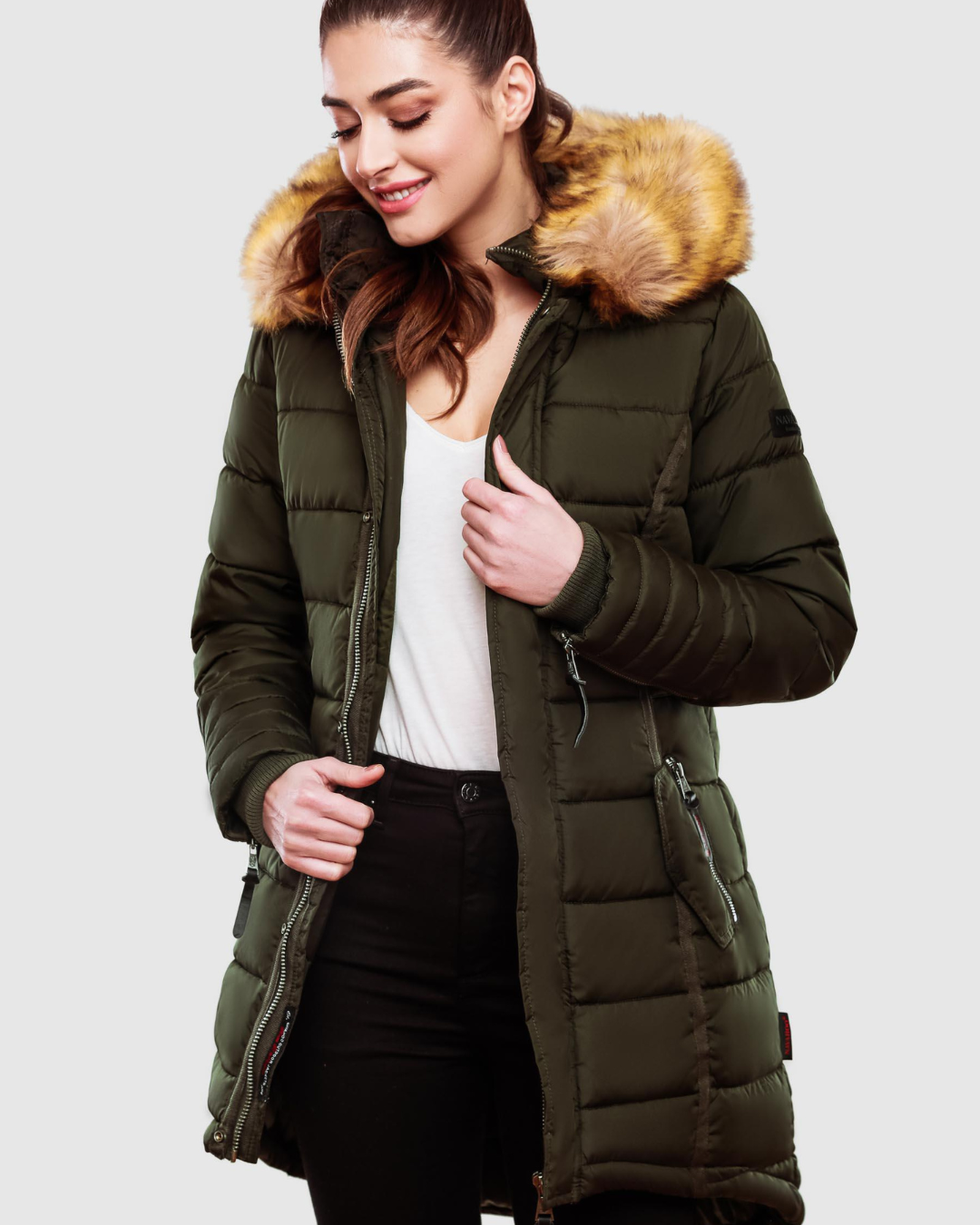 Dames gewatteerde parka jas met capuchon en nepbont rand. Kenmerkt ritssluiting met stormflap en knopsluiting aan voorzijde. Bevat horizontale gewatteerde panelen door geheel, twee zijzakken met ritssluiting en lange mouwen met elastische manchetten.