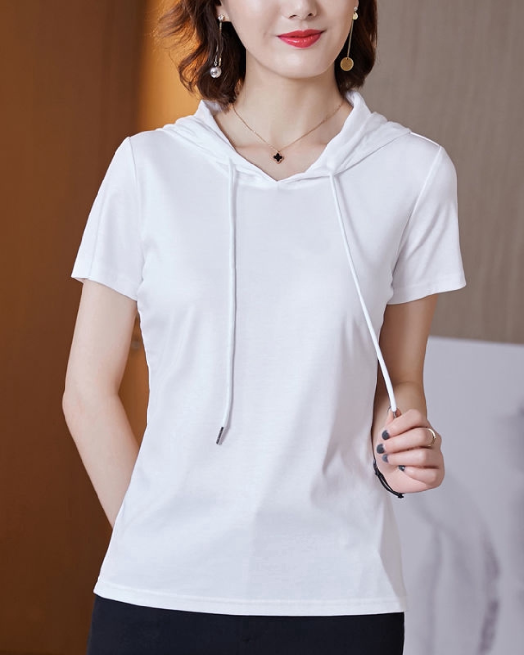 Dames hoodie met korte mouwen en capuchon met verstelbare trekkoorden. Kenmerkt split detail aan onderzijde en geribbelde afwerking. Bevat effen kleur constructie.