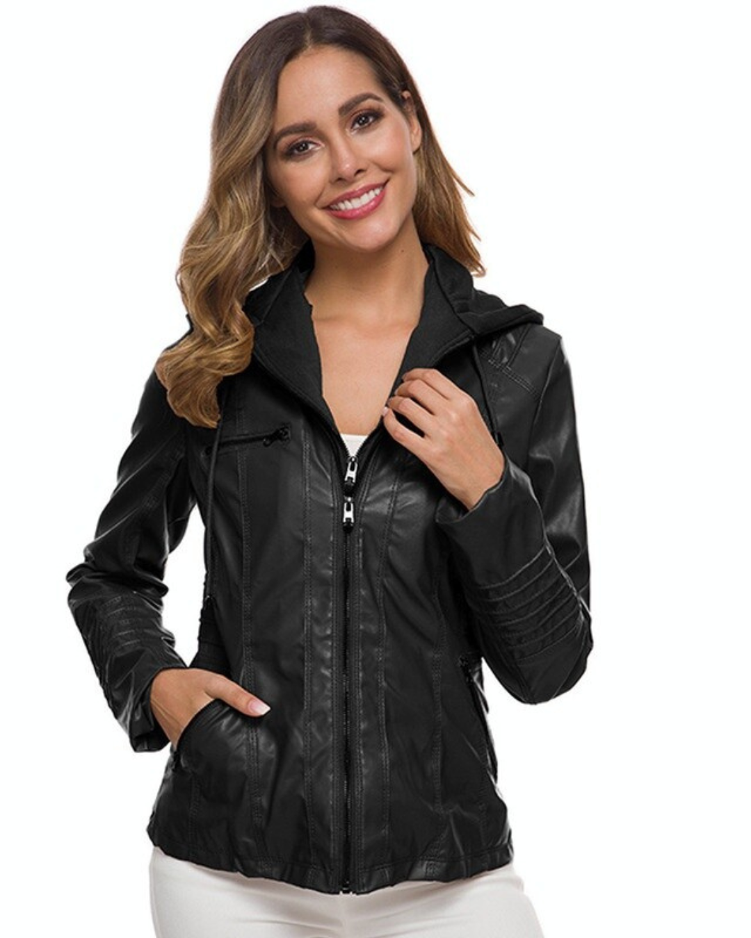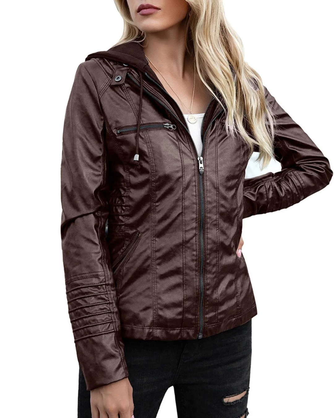 Dames Leren Jas met Afneembare Capuchon en Ritssluiting