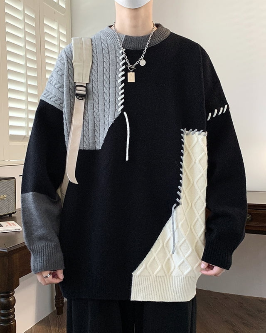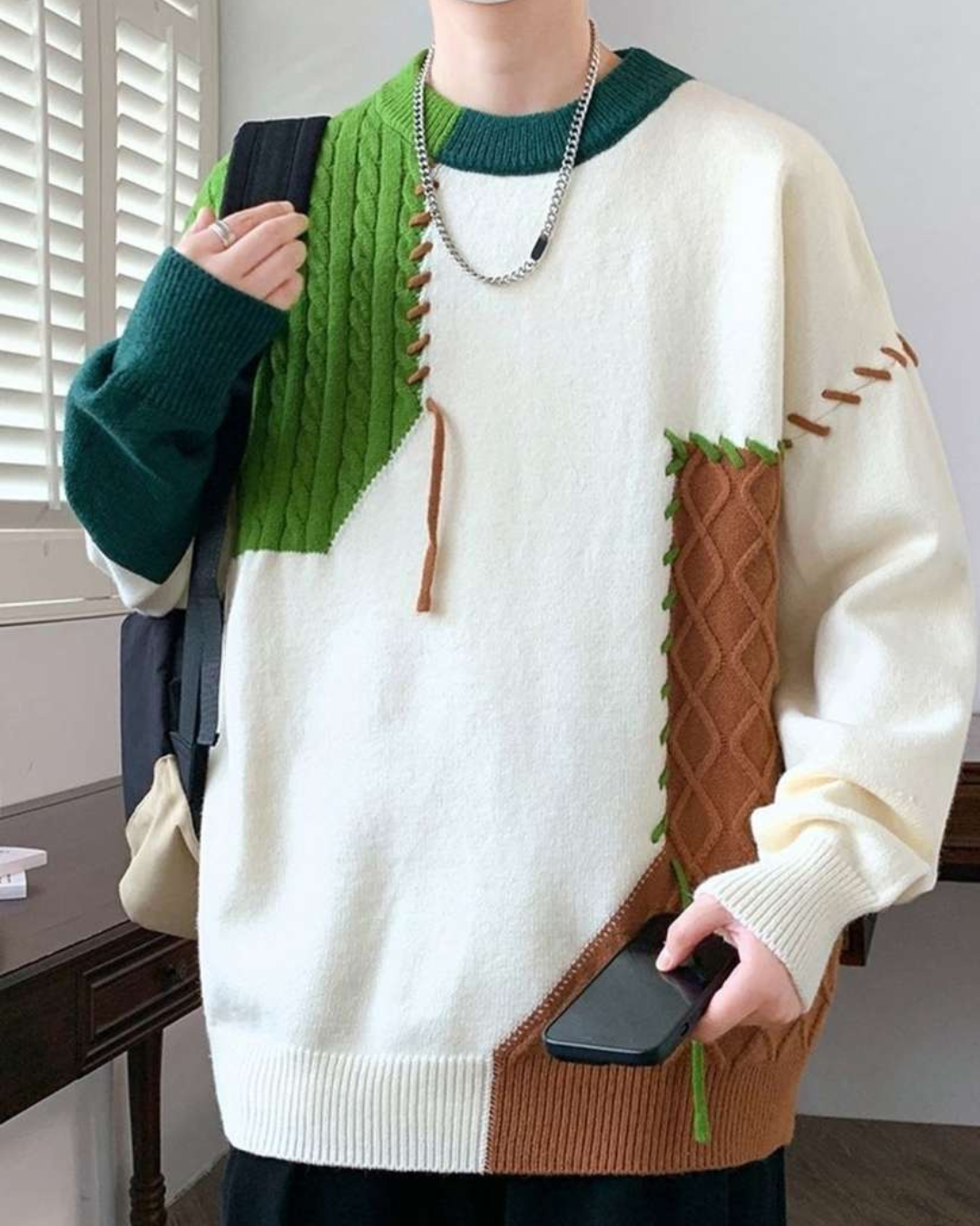 Heren Gebreide Trui met Colorblock Panelen en Contrasterende Stiksels