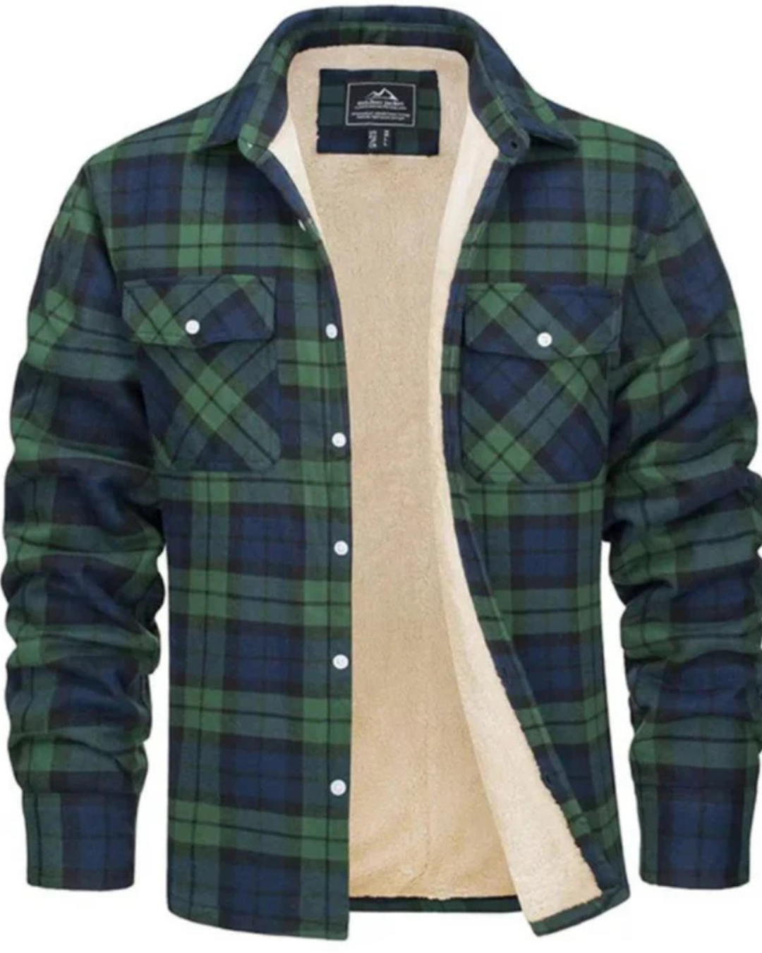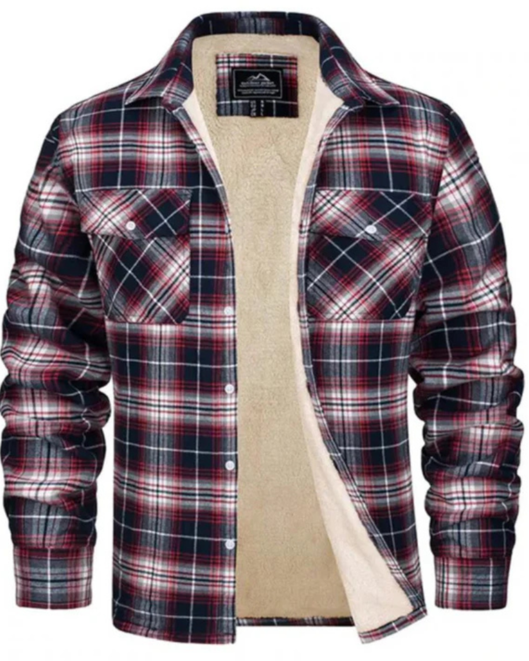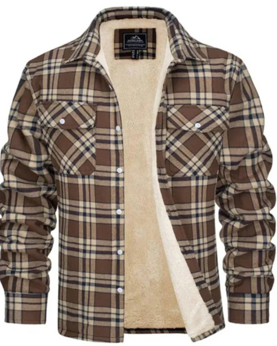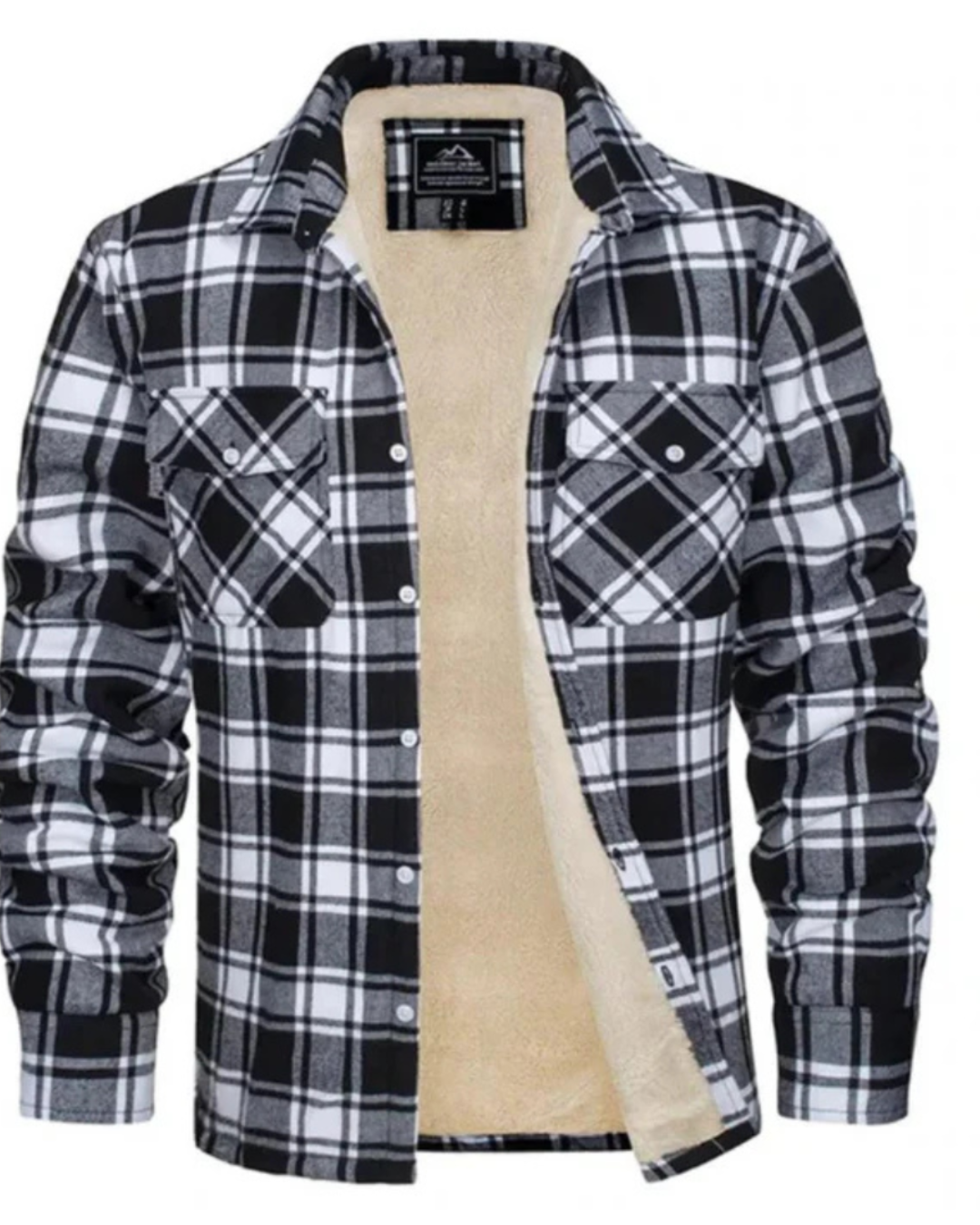 Heren geruit jas met teddy voering aan binnenzijde en knopsluiting aan voorzijde. Kenmerkt kraag en lange mouwen met manchetten. Bevat twee borstzakken met klepjes en knopsluiting.