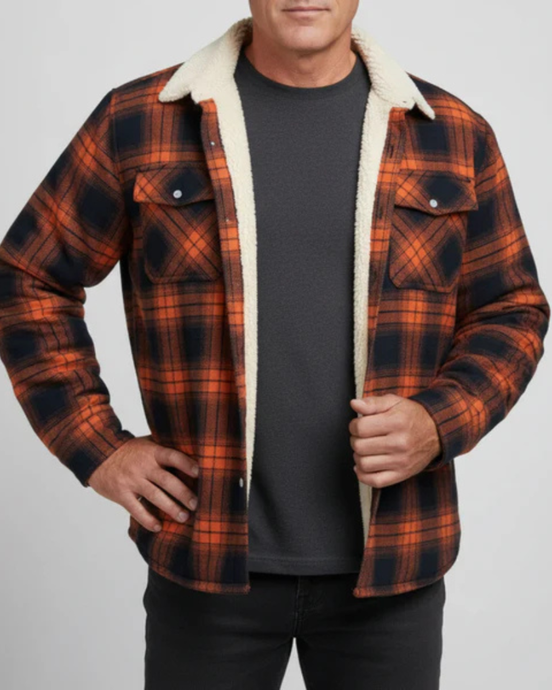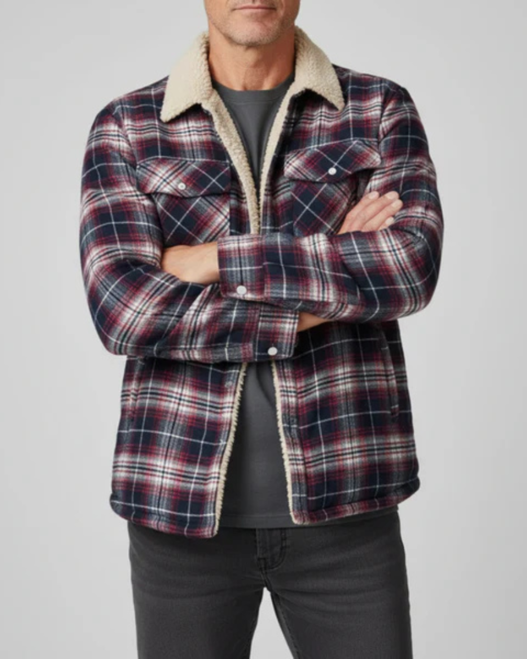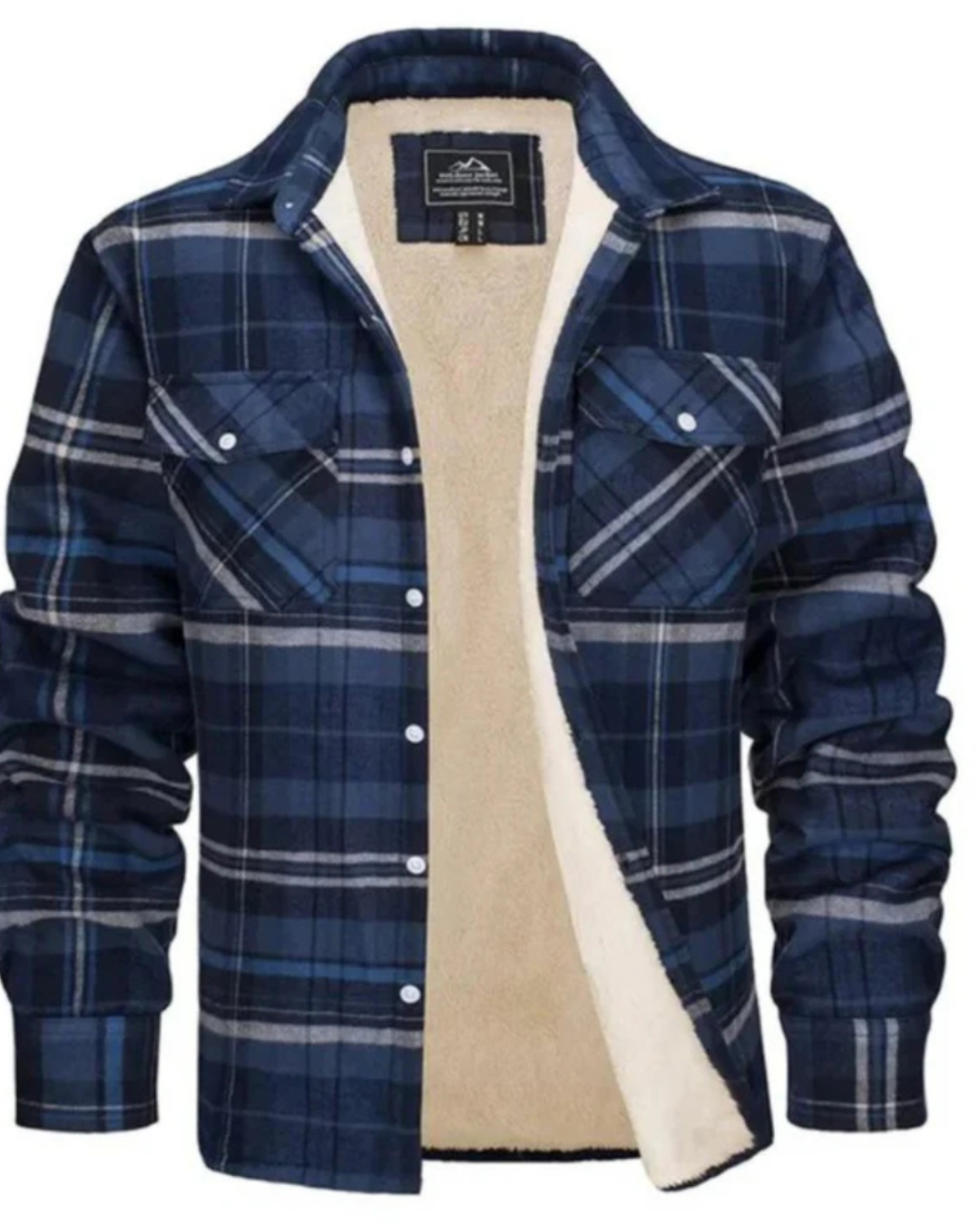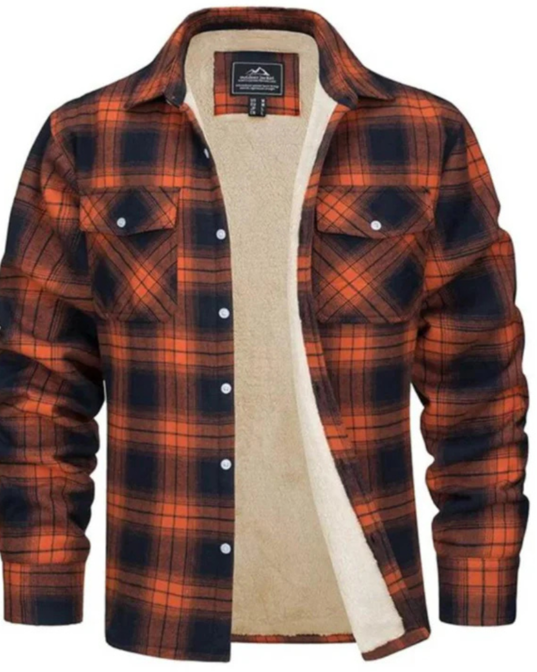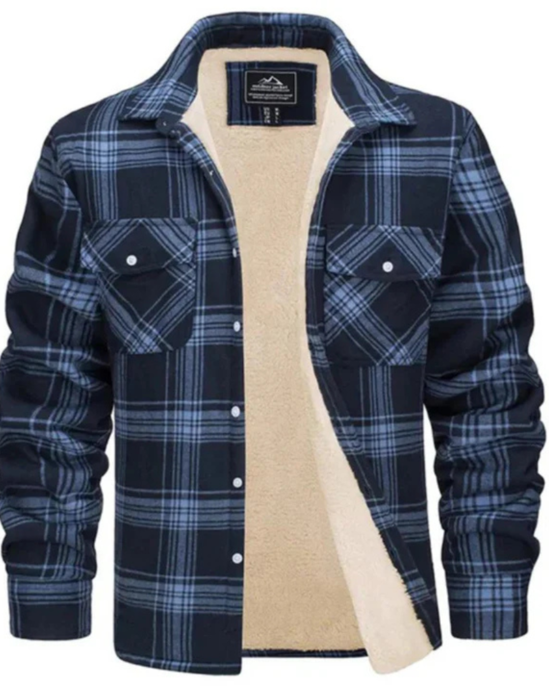 Heren geruit jas met teddy voering aan binnenzijde en knopsluiting aan voorzijde. Kenmerkt kraag en lange mouwen met manchetten. Bevat twee borstzakken met klepjes en knopsluiting.